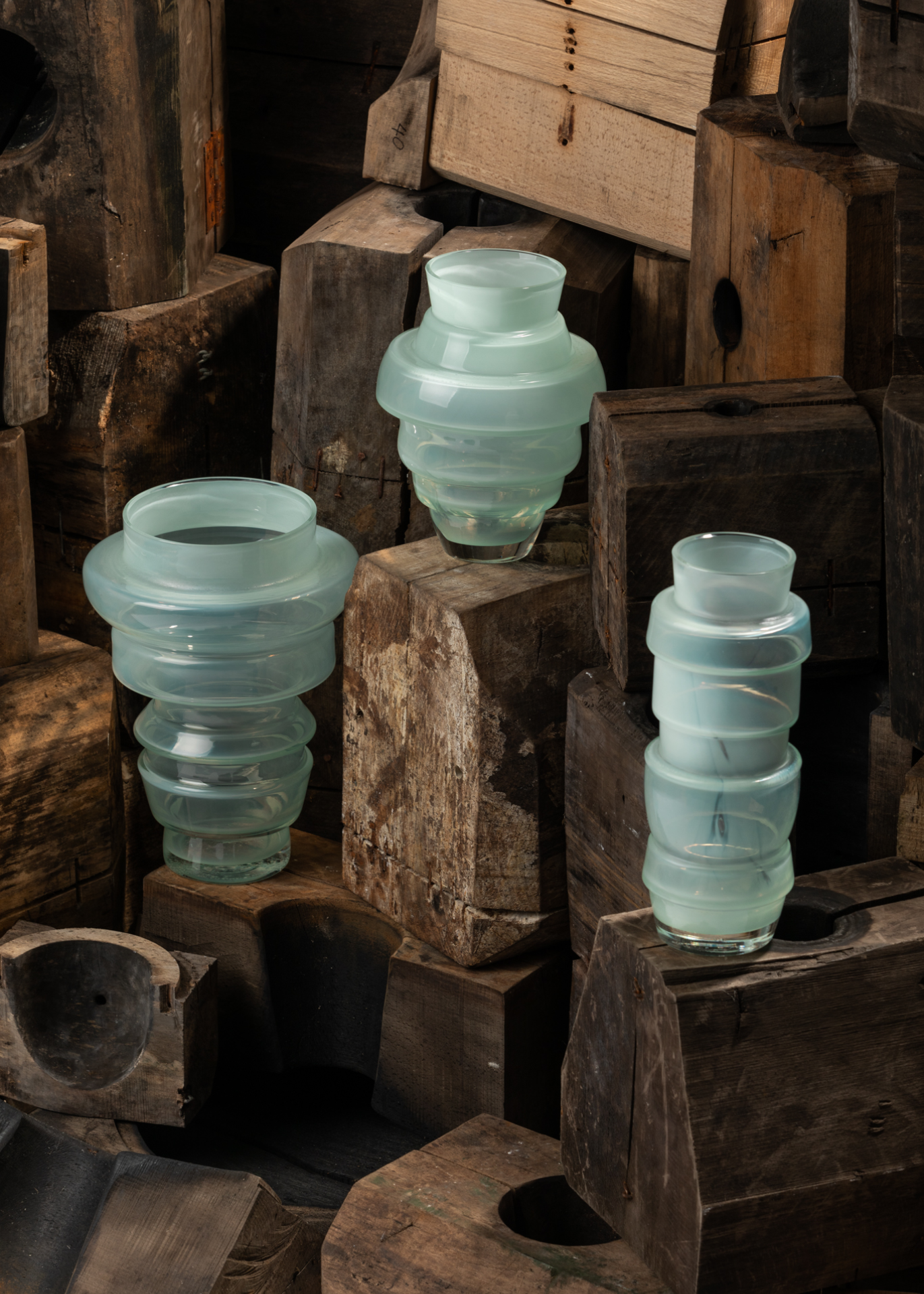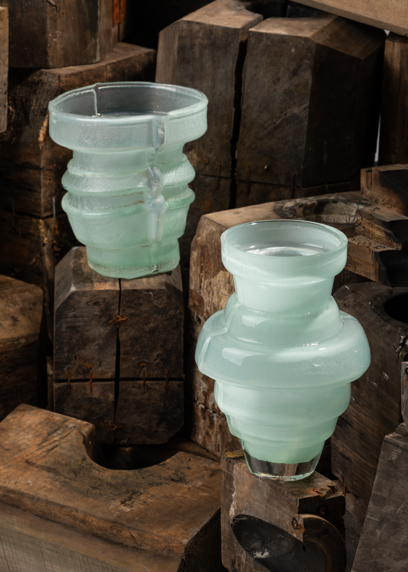 The Leftovers collection embodies Hana’s distinctive approach to materials, glass production and their mutual relationship. Her projects are driven by a continuous fascination with process. She deliberately employs materials that are visually overlooked, consumerist and often at the end of their life cycle. Corrugated cardboard molds have become an inherent part of her work, yet she also questions the fate of traditional wooden molds—those that have reached the end of their useful life and lying around in corners. Can mere re-use be enough to make us pay attention to them as new goods?